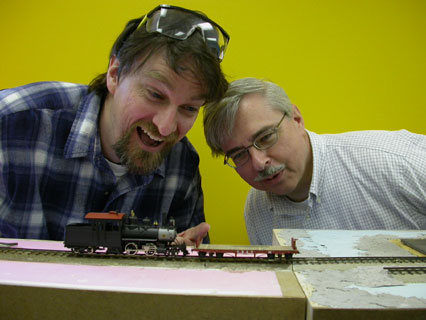 David Keith and Lee Rainey celebrate the first train crossing between their modules. This CR&N train ran most of the day, pressuring the SR&RL track gang to lay more rail. (Jim Amato photo)