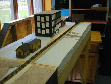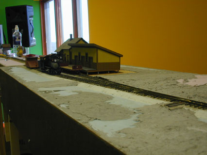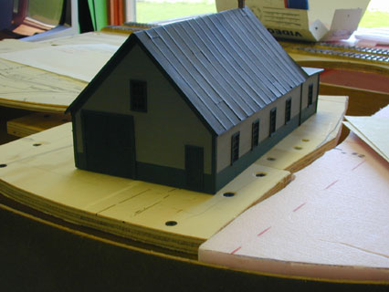 An overall view of the Damariscotta Mills module. The mockup of the mill is at the rear, the trackwork was temporary. The near structures were for display.