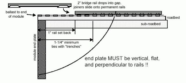 FAQ3.3.1 Many modules have been built using HOn3 homabed (http://www.homabed.com) for roadbed.  It’s nominal height of .218″ (~7/32″) along with 5″ high ties (.078″ ~5/64″) and code 70 rail (0.78″) results in a height of rail being .366″ .  Considering that some modules may use HOn3 flex track or code 55 rail, the rail height standard is being set as: Min 11/32″ Max: 3/8″ above end plate.